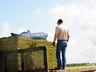 The driver leaves the turf farm to travel back to All American Stone and Turf in the College Station-Bryan area.